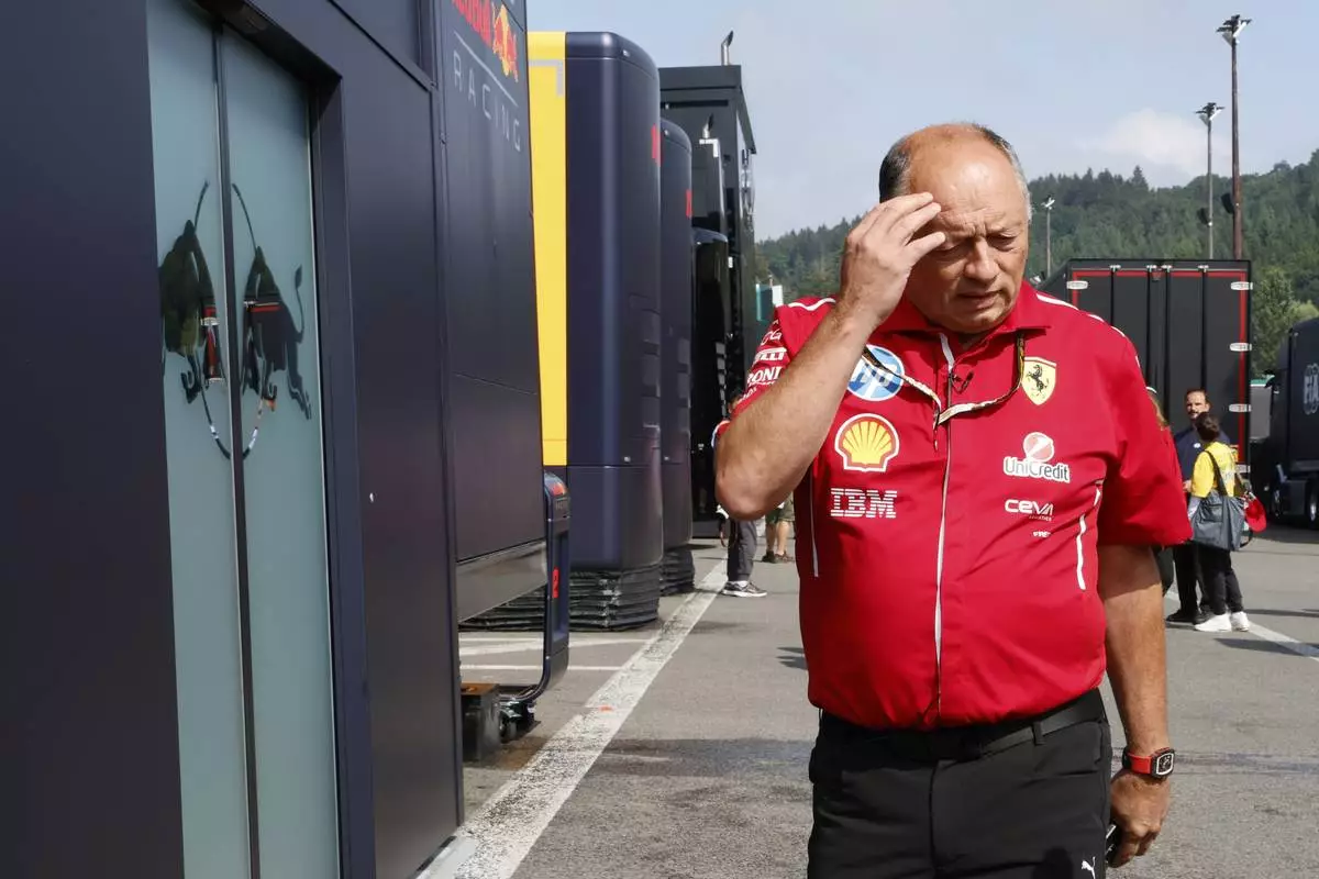 Ferrari team principal Frederic Vasseur outside the team garage prior to the first practice session ahead of the Formula One Grand Prix at the Spa-Francorchamps racetrack in Spa, Belgium, Friday, July 25, 2025. (AP Photo/Geert Vanden Wijngaert)