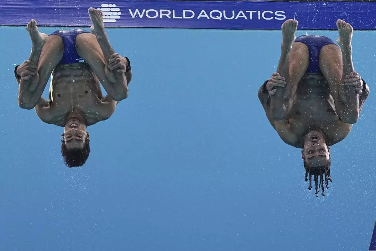 Luis Felipe Bonfim Dos Santos Moura of Brazil competes in the mixed 3m and 10m team diving final at the World Aquatics Championships in Singapore, Saturday, July 26, 2025. (AP Photo/Ng Han Guan)