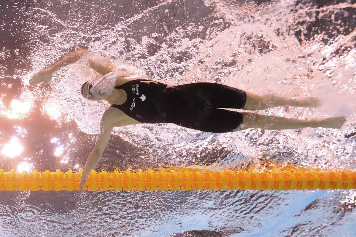 Summer McIntosh of Canada competes in the women's 400-meter freestyle heat at the World Aquatics Championships in Singapore, Sunday, July 27, 2025. (AP Photo/Lee Jin-man)