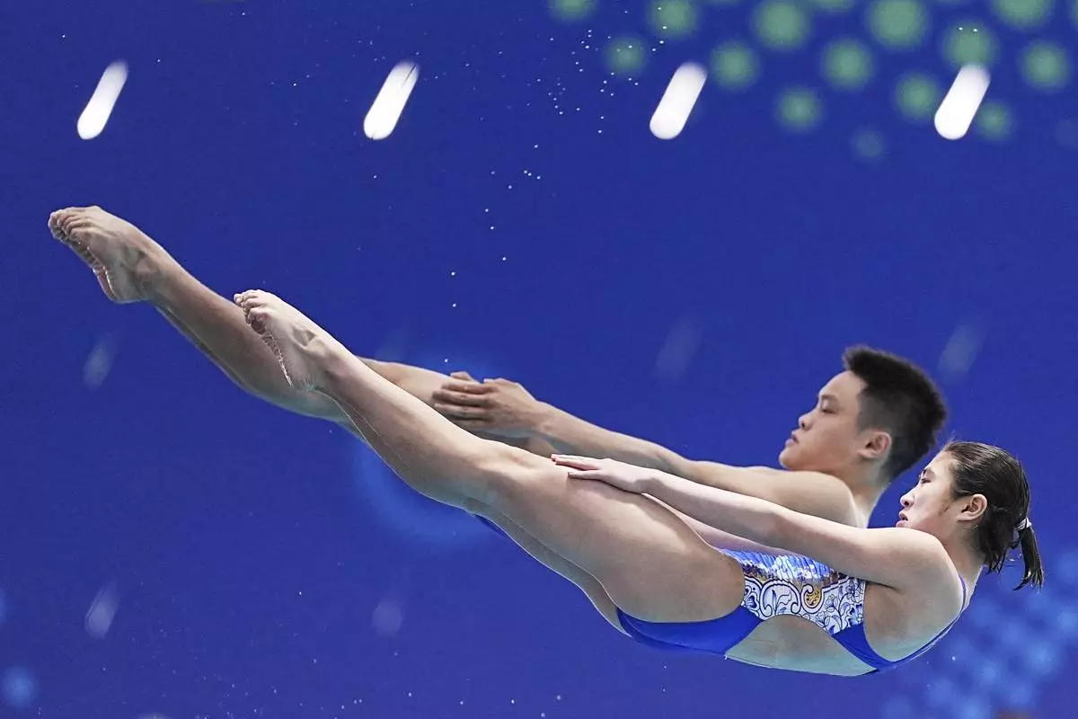 Xie Peiling and Zhu Yongxin of China compete in the mixed 10m synchronised finals at the World Aquatics Championships in Singapore, Sunday, July 27, 2025. (AP Photo/Ng Han Guan)
