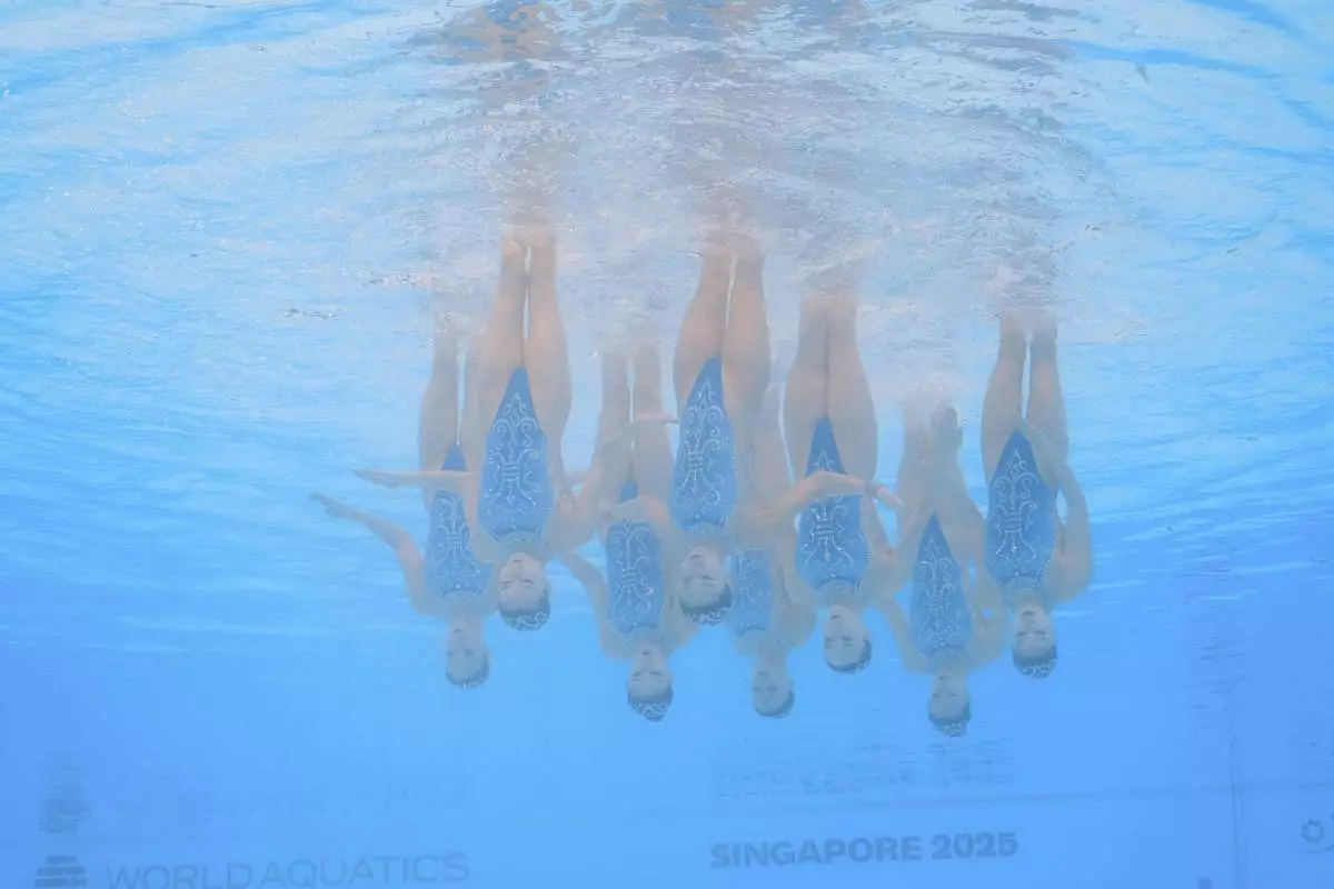 Team China compete in the team free preliminary of artistic swimming at the World Aquatics Championships in Singapore, Saturday, July 19, 2025. (AP Photo/Lee Jin-man)