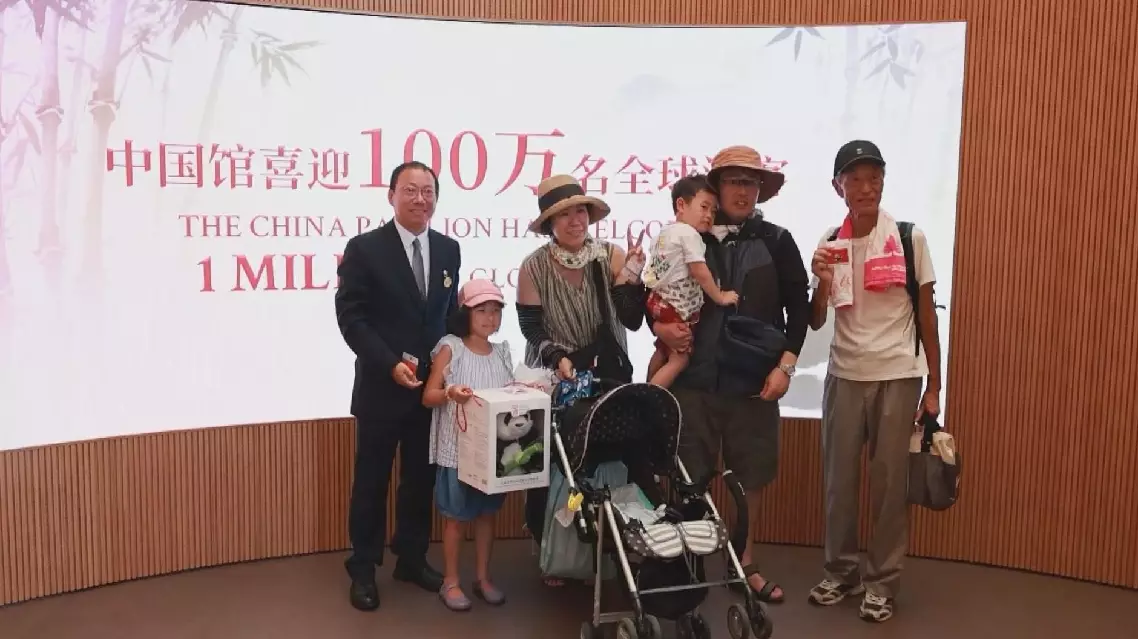 On Wednesday afternoon, when Asakawa family entered the China Pavilion, they were greeted with words of "Welcome the millionth visitor to the China Pavilion" displayed on a big screen and presented with a panda doll and other cultural and creative souvenirs as commemorative gifts.