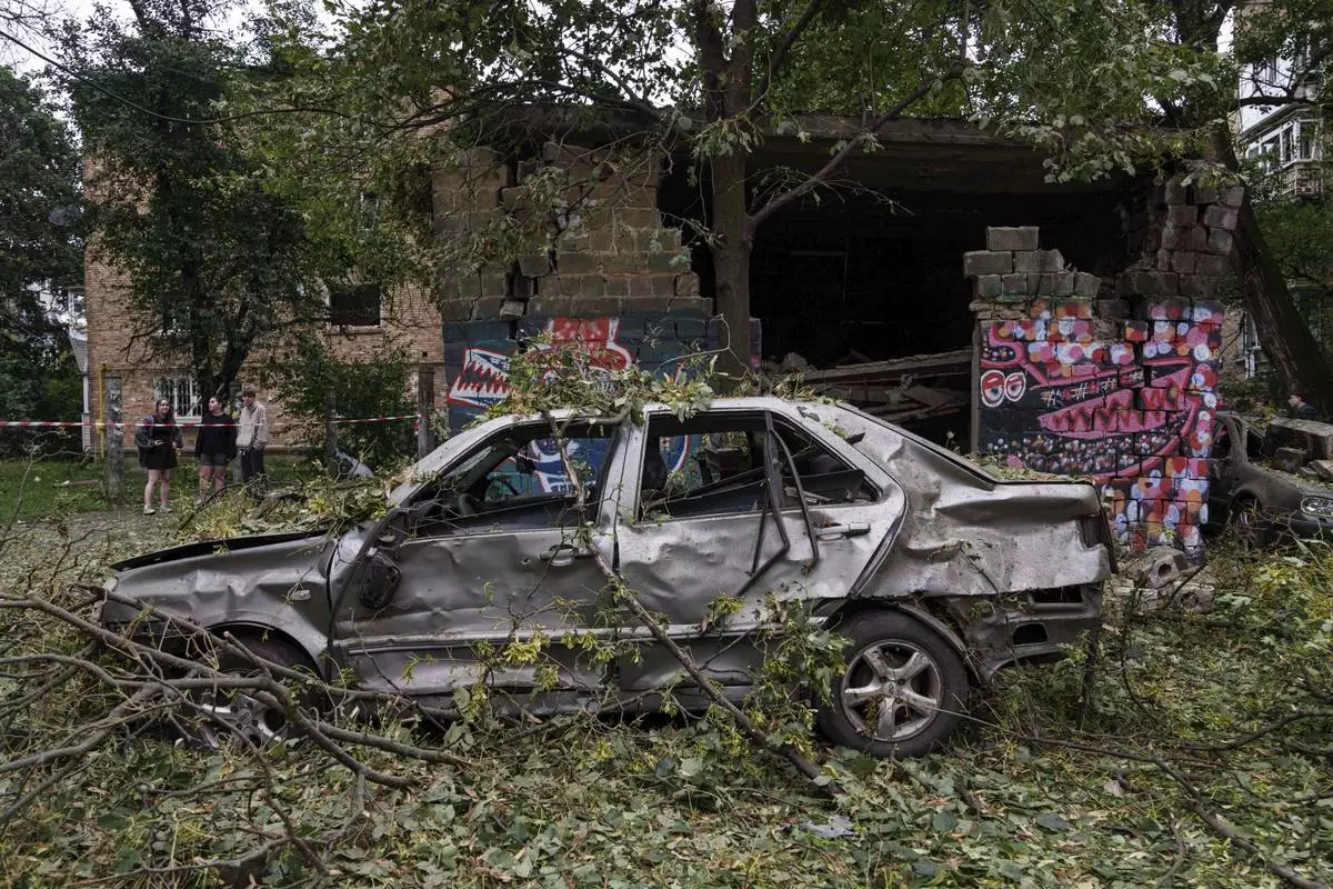 A car is seen damaged after a Russian strike in Kyiv, Ukraine, on Thursday, July 31, 2025. (AP Photo/Evgeniy Maloletka)