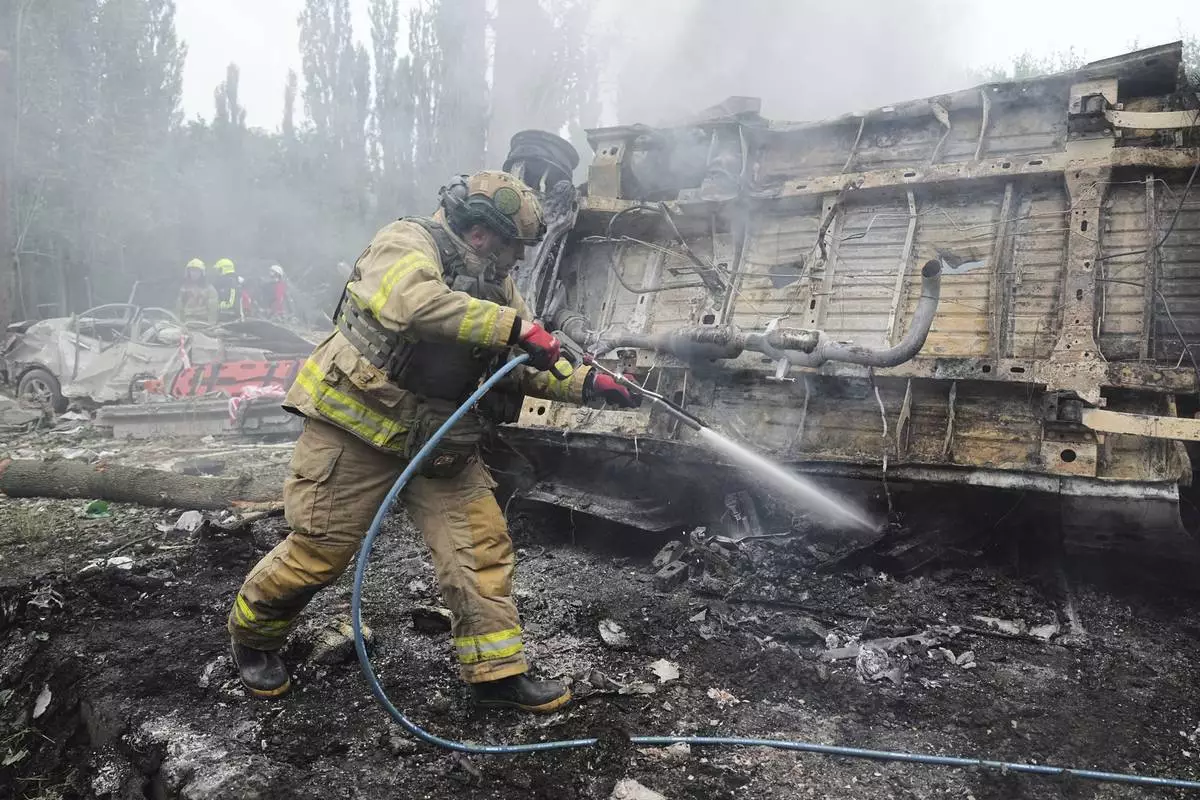 A rescue worker puts out fire on a residential building heavily damaged by a Russian strike in Kyiv, Ukraine, on Thursday, July 31, 2025. (AP Photo/Evgeniy Maloletka)