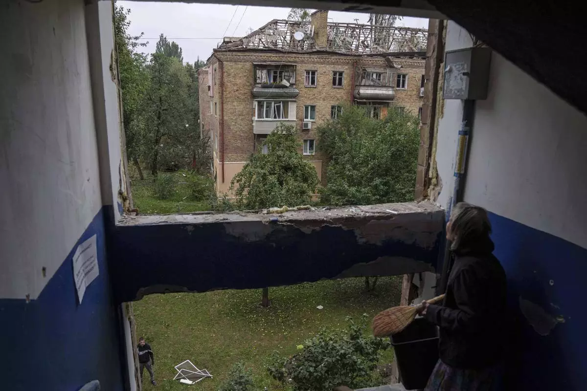 A local woman looks at a residential building heavily damaged by a Russian strike in Kyiv, Ukraine, on Thursday, July 31, 2025. (AP Photo/Evgeniy Maloletka)