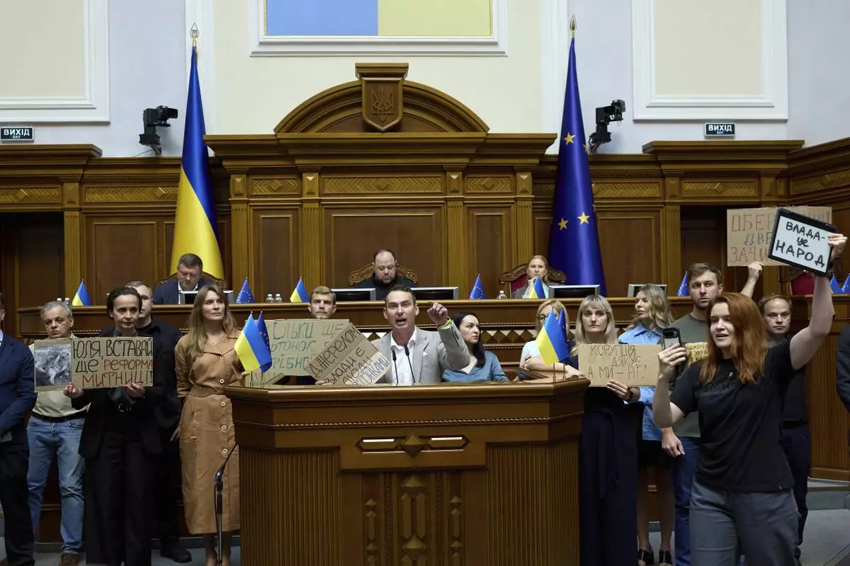 Ukrainian lawmakers are calling to vote for a new bill proposed by President Volodymyr Zelenskyy restoring the independence of the country's anti-corruption agencies at the parliament session hall in Kyiv, Ukraine, Thursday, July 31, 2025.(AP Photo/Vadym Sarakhan)