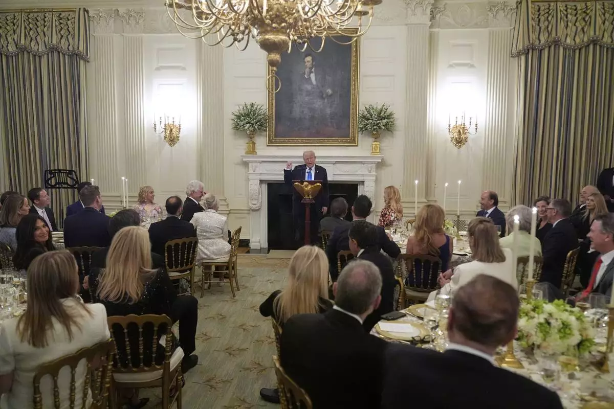 FILE - President Donald Trump speaks during a Kennedy Center board dinner in the State Dining Room at the White House, May 19, 2025, in Washington. (AP Photo/Manuel Balce Ceneta, File)