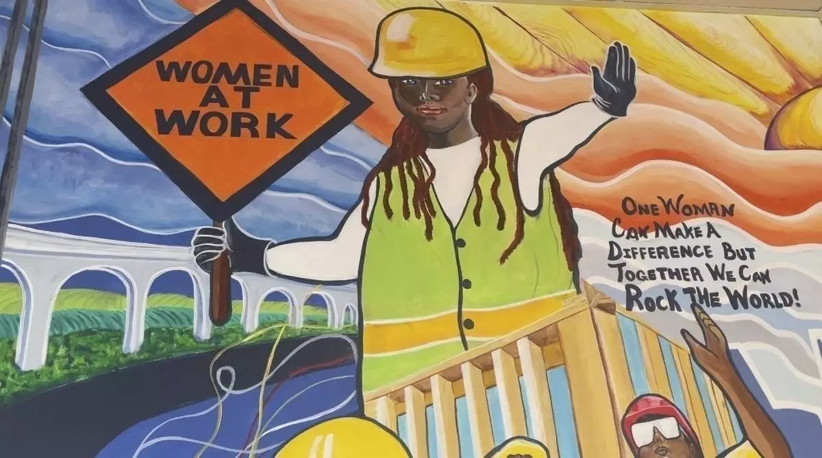 FILE - A mural by artist Tene Smith is seen near the entrance of Chicago Women in Trades, a nonprofit dedicated to training and retaining women in the skilled construction trades is photographed April 1, 2025, at the facility in Chicago. (AP Photo/Claire Savage, File)