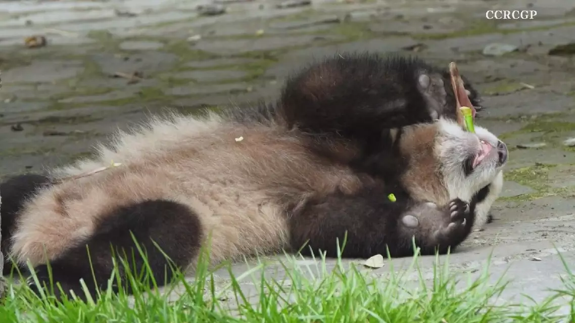 The second clip shows the other panda "Xidouzai," panda mother Xi Dou's cub, clutching a fresh bamboo shoot and constantly adjusting its positions to find the most comfortable way to enjoy the tasty bamboo.