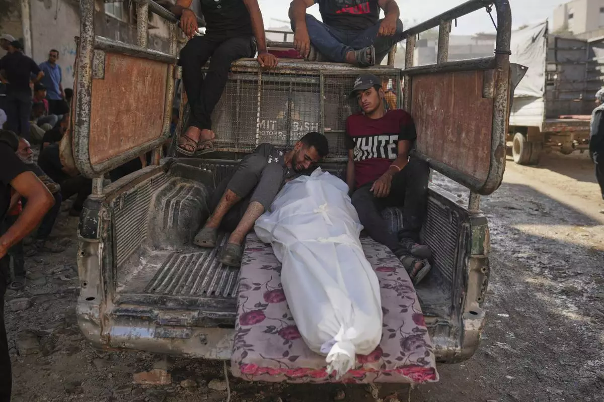 Palestinians mourn around the body of a man killed while trying to reach aid trucks entering northern Gaza through the Zikim crossing with Israel, at Shifa Hospital in Gaza City, Thursday, July 31, 2025. (AP Photo/Jehad Alshrafi)