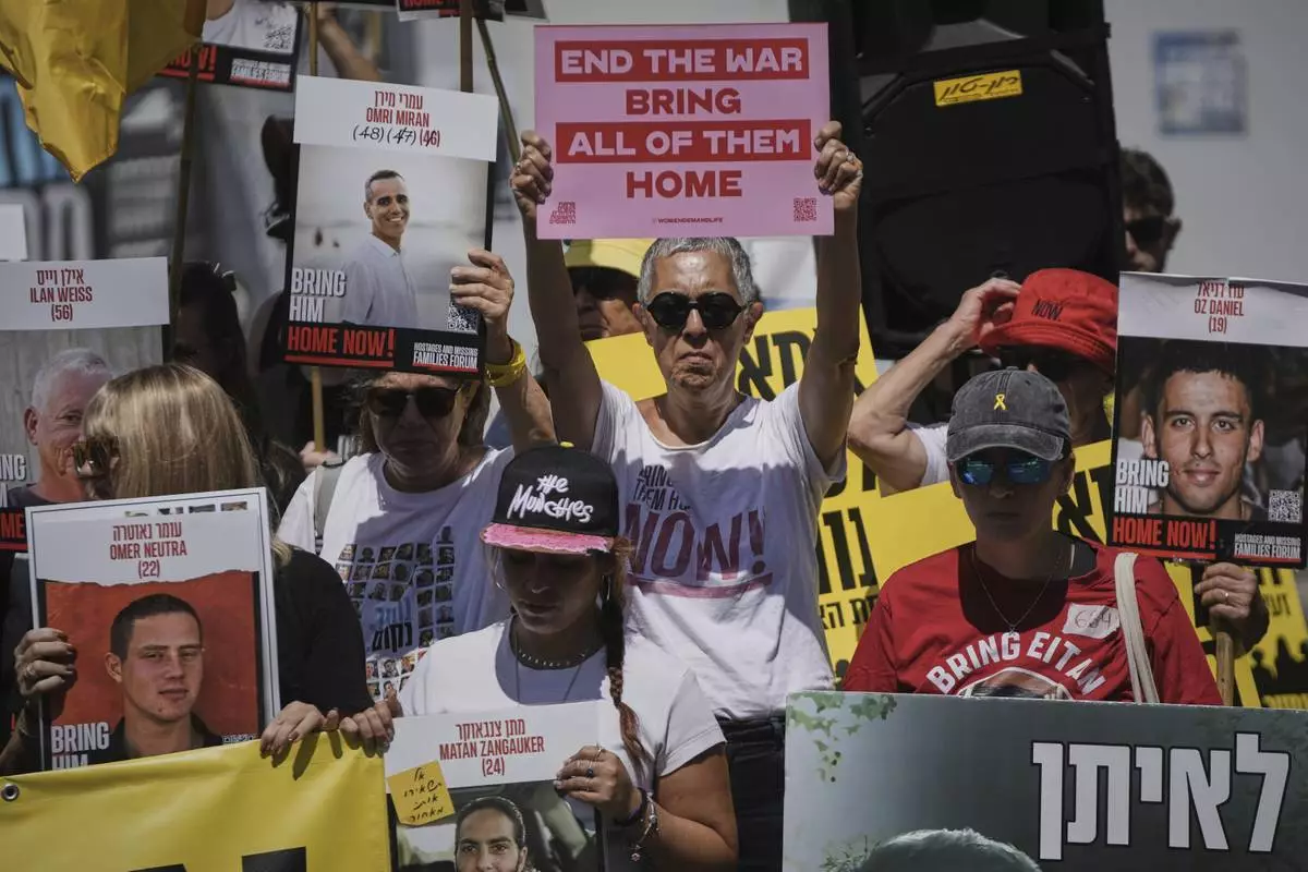Relatives and supporters of Israeli hostages held in the Gaza Strip attend a protest demanding their release from Hamas captivity and calling for an end to the war, outside the Prime Minister's office in Jerusalem Thursday, July 31, 2025. (AP Photo/Mahmoud Illean)