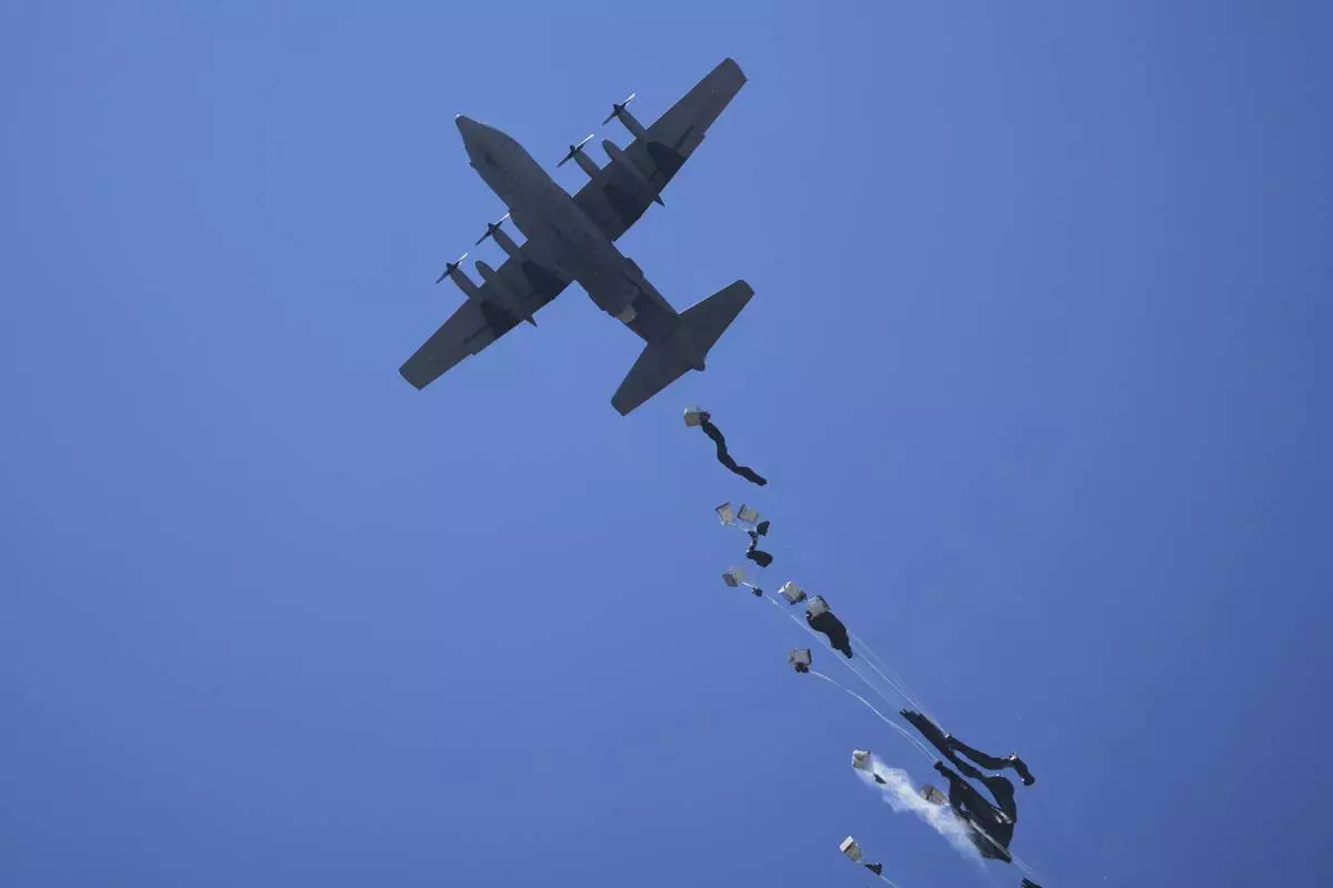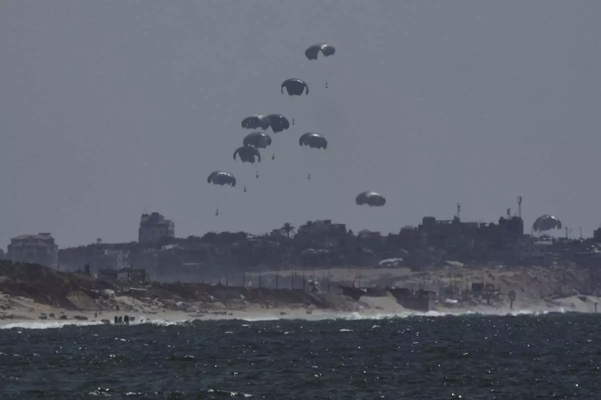 Humanitarian aid is airdropped to Palestinians over northern Gaza Strip, Thursday, July 31, 2025. (AP Photo/Jehad Alshrafi)
