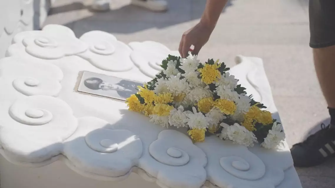 In the cemetery shaded by towering pines, a line of over 80 Americans, most of whom are high school or college students, stood silently and placed chrysanthemums on the tombstone of Beneda in Hubei.