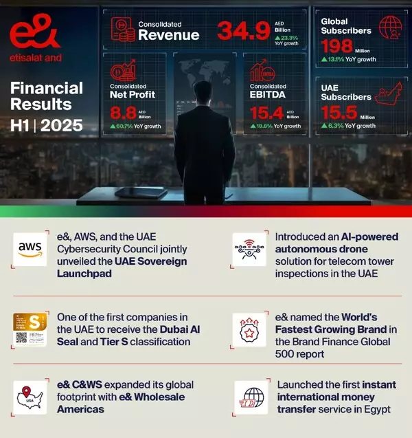 "In H1, e& continued its growth trajectory, delivering consolidated revenue of AED 34.9 billion—a year-on-year increase of 23.3 per cent—and achieving consolidated net profits of AED 8.8 billion, up 60.7 per cent compared to the same period last year. Alongside our outstanding financial performance, we maintained our focus on bringing the latest technologies to best serve our customers. We launched the UAE Sovereign Cloud Launchpad alongside AWS and the UAE Cybersecurity Council. This landmark initiative advances national priorities around digital sovereignty, secure AI, and cloud innovation, and is set to unlock enduring value for the nation's digital economy.