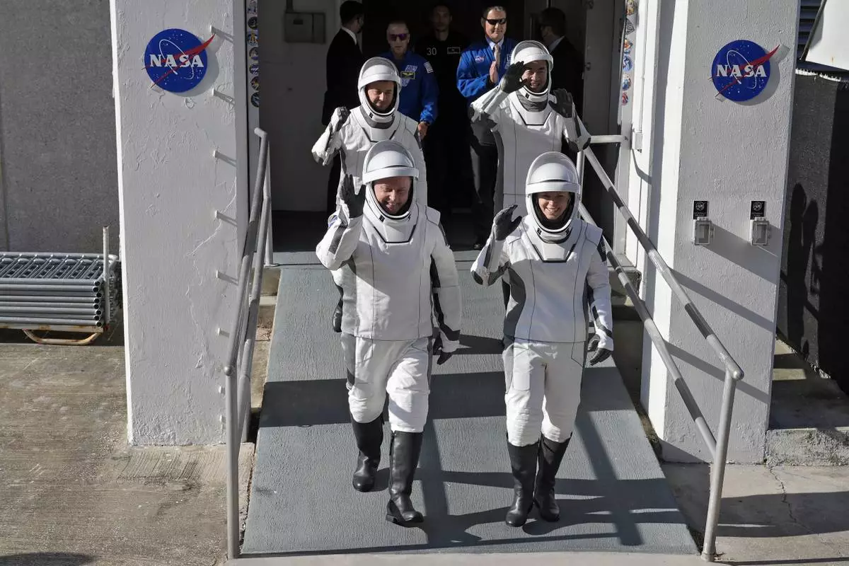 Astronauts, front row from left, Mike Fincke, of NASA, and Zena Cardman, of NASA, back row from left, Oleg Platonov, of Russia and Kimiya Yui, of Japan waves as they leave the Operations and Checkout Building for a trip the Kennedy Space Center's Launch Pad 39-A and a planned liftoff on a SpaceX Falcon 9 rocket Thursday, July 31, 2025, in Cape Canaveral , Fla. (AP Photo/John Raoux)