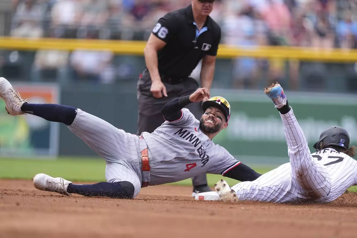 Minnesota Twins shortstop Carlos Correa, left, tags out Colorado Rockies' Jordan Beck as he tries to steal second base in the first inning of a baseball game Sunday, July 20, 2025, in Denver. (AP Photo/David Zalubowski)