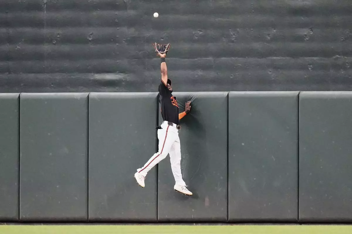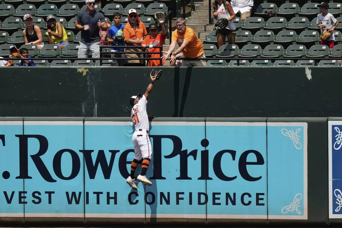 Baltimore Orioles center fielder Cedric Mullins jumps to catch a fly ball hit by Toronto Blue Jays' Nathan Lukes for the out during the fourth inning of a baseball game, Monday, July 28, 2025, in Baltimore. (AP Photo/Stephanie Scarbrough)
