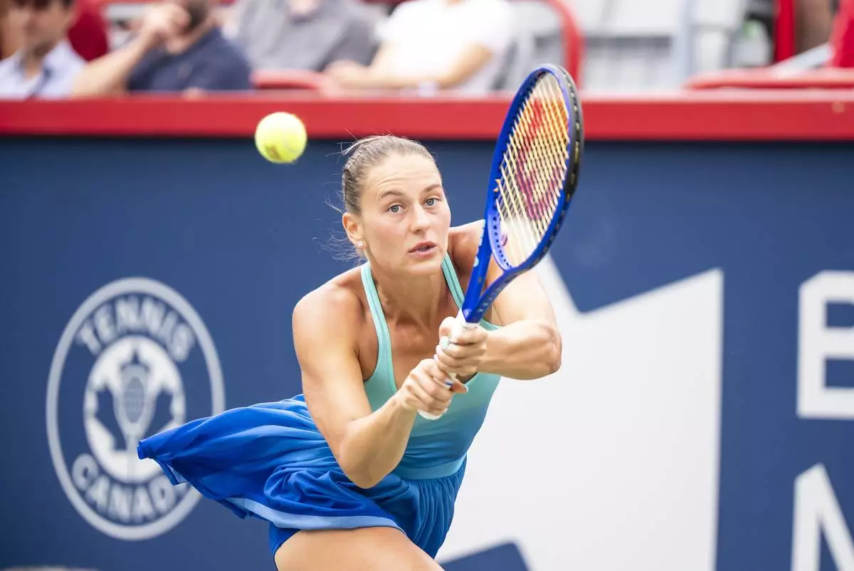 Marta Kostyuk, of Ukraine, hits a return against Daria Kasatkina, of Australia, during the National Bank Open women’s tennis tournament, Thursday, July 31, 2025, in Montreal. (Christopher Katsarov/The Canadian Press via AP)