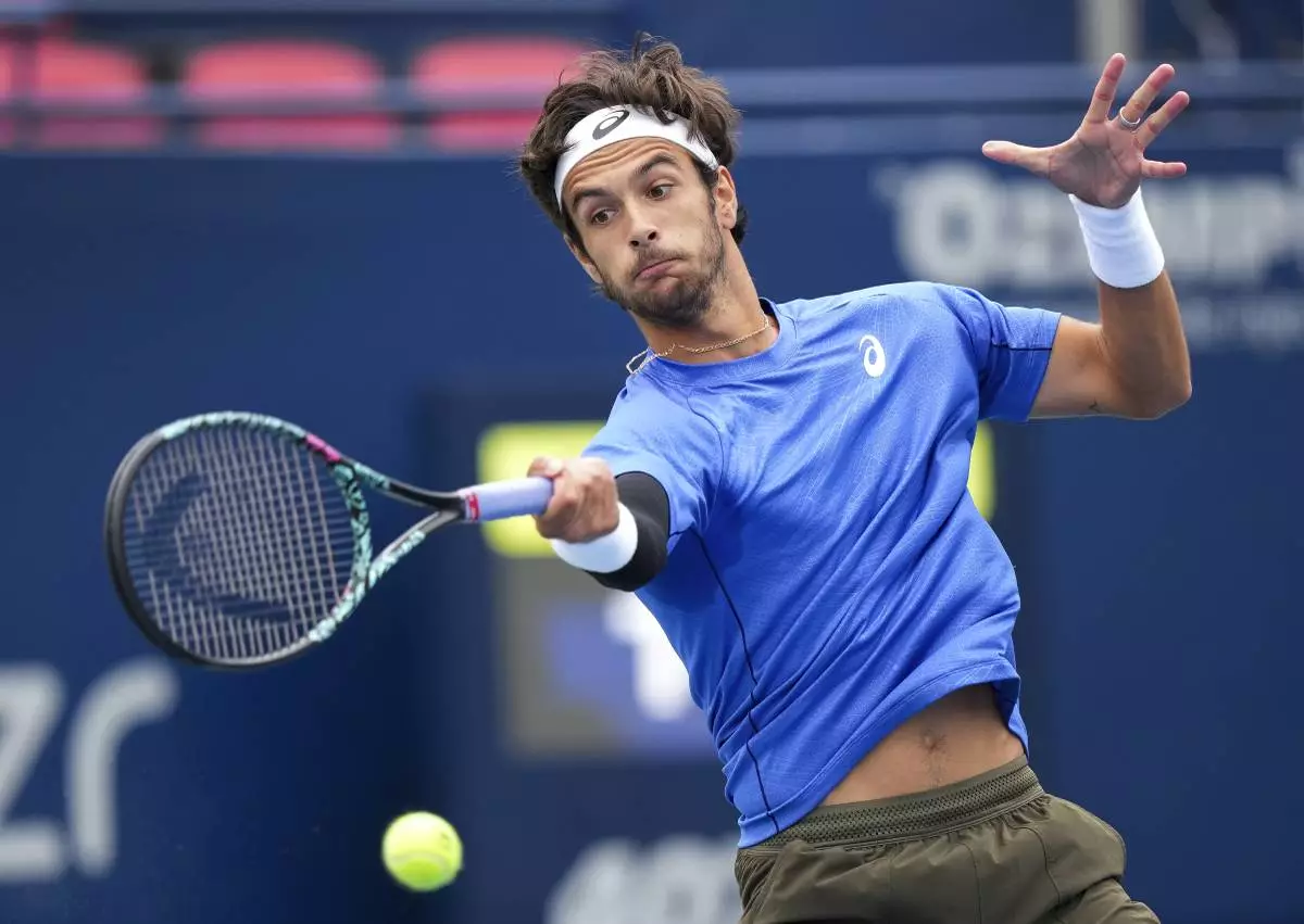 Alex Michelsen, of the United States, returns the ball against Lorenzo Musetti, of Italy, during a match at the National Bank Open men’s tennis tournament, Thursday, July 31, 2025, in Toronto. (Nathan Denette/The Canadian Press via AP)