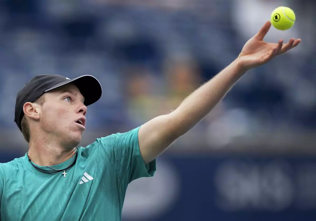 Alex Michelsen, of the United States, serves the ball against Lorenzo Musetti, of Italy, during a match at the National Bank Open men’s tennis tournament, Thursday, July 31, 2025, in Toronto. (Nathan Denette/The Canadian Press via AP)