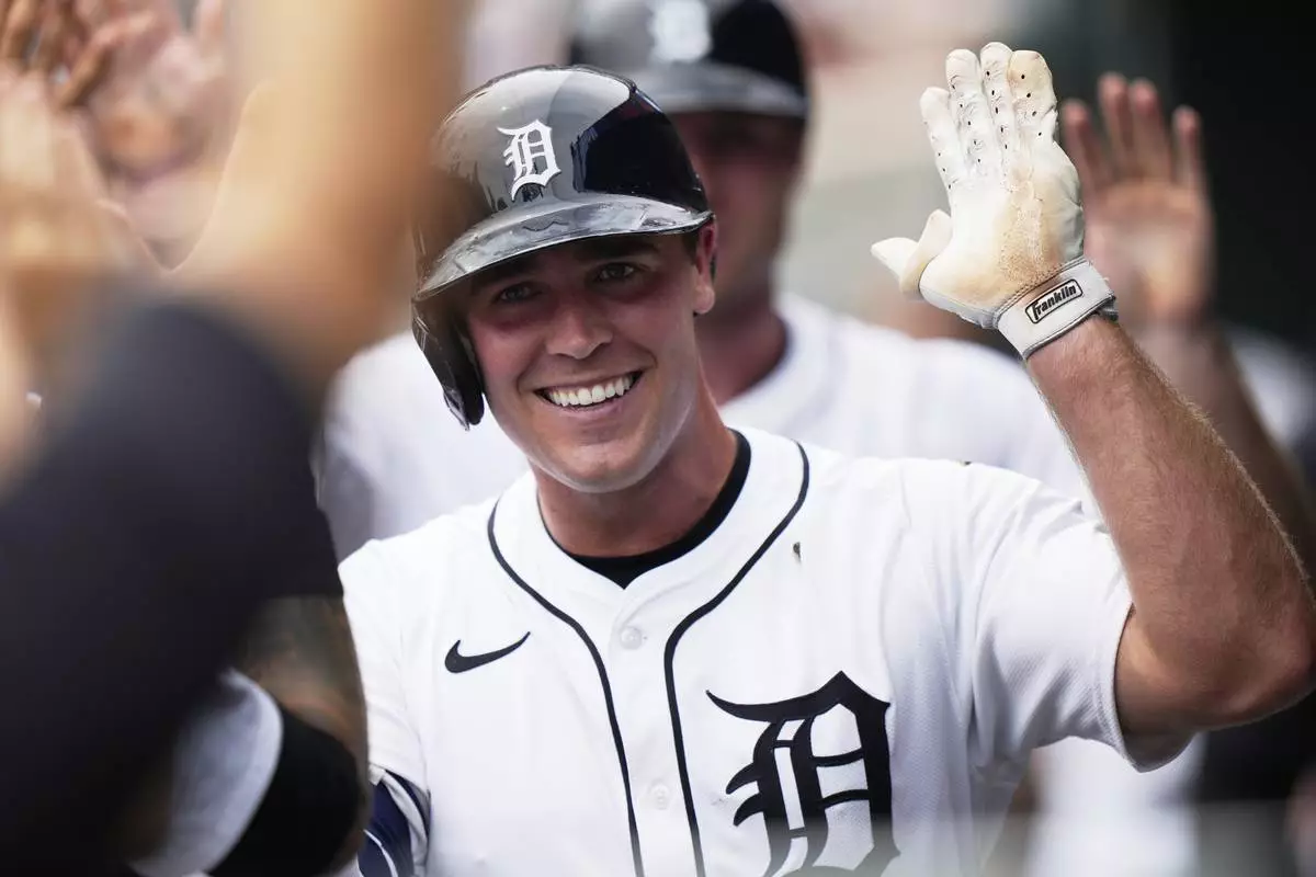 Detroit Tigers' Kerry Carpenter celebrates in the dugout after hitting a two-run home run during the sixth inning of a baseball game against the Arizona Diamondbacks, Wednesday, July 30, 2025, in Detroit. (AP Photo/Ryan Sun)