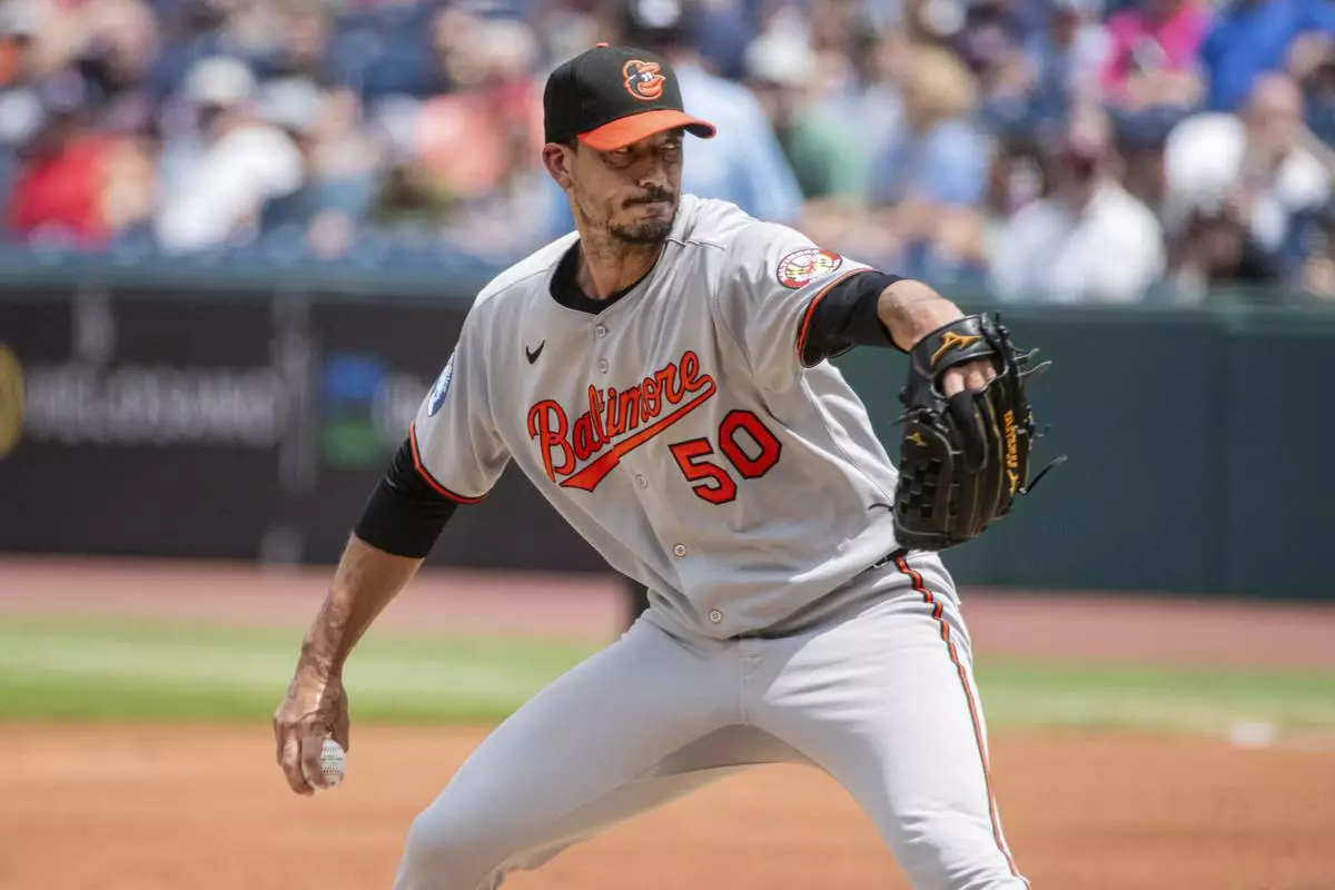 Baltimore Orioles starting pitcher Charlie Morton delivers against the Cleveland Guardians during the first inning of a baseball game, Thursday, July 24, 2025, in Cleveland. (AP Photo/Phil Long)