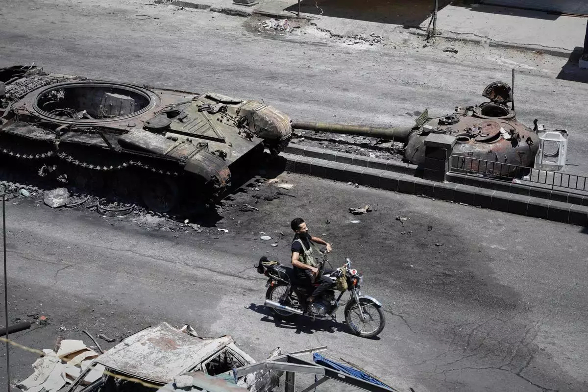A Druze militiaman rides his motorcycle past a destroyed military vehicle following last week's sectarian clashes in the Druze-majority town of Sweida, Syria, Friday, July 25, 2025. (AP Photo/Omar Sanadiki)