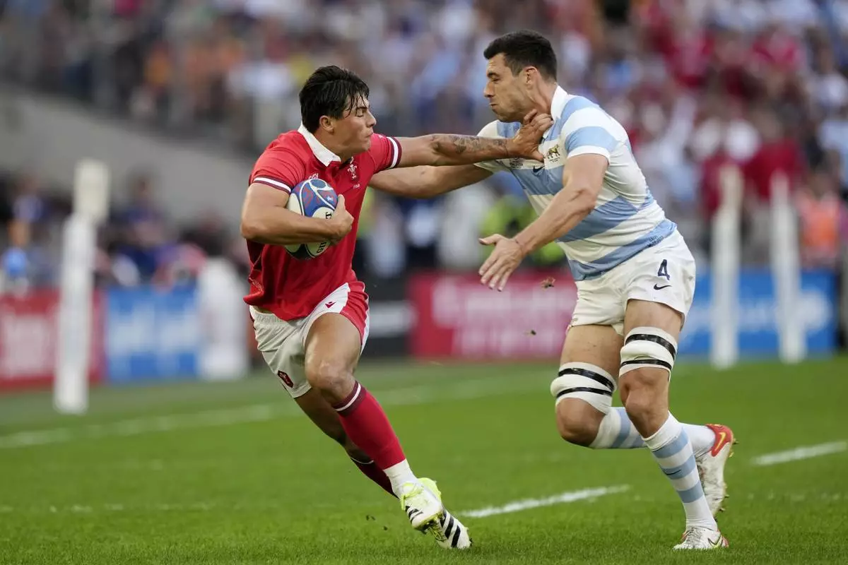FILE - Wales' Louis Rees-Zammit pushes away Argentina's Guido Petti Pagadizabal, right, during the Rugby World Cup quarterfinal match between Wales and Argentina at the Stade de Marseille in Marseille, France, Oct. 14, 2023. (AP Photo/Lewis Joly, File)