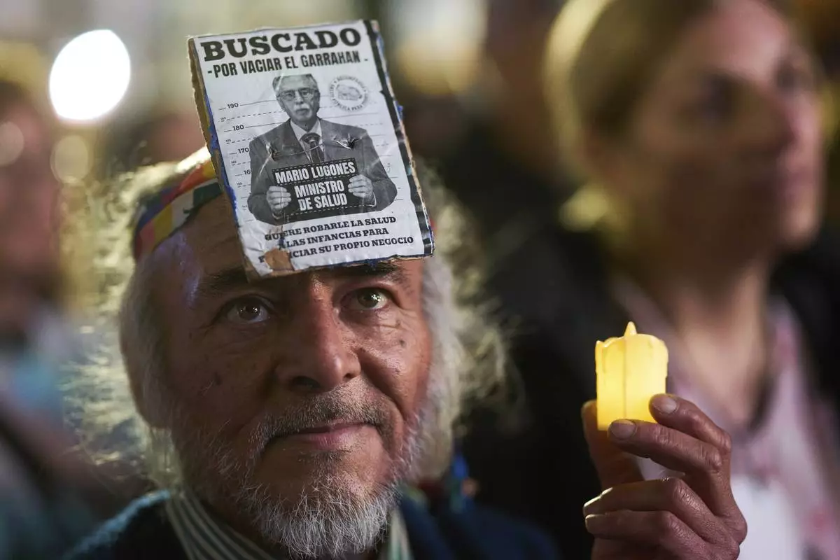 A demonstrator holds a candle while wearing a "wanted" sign of Heath Minister Mario Lugones on his forehead during a demonstration to demand better salaries and increased funding for the Garrahan pediatric public Hospital, in Buenos Aires, Argentina, Thursday, July 31, 2025. (AP Photo/Rodrigo Abd)