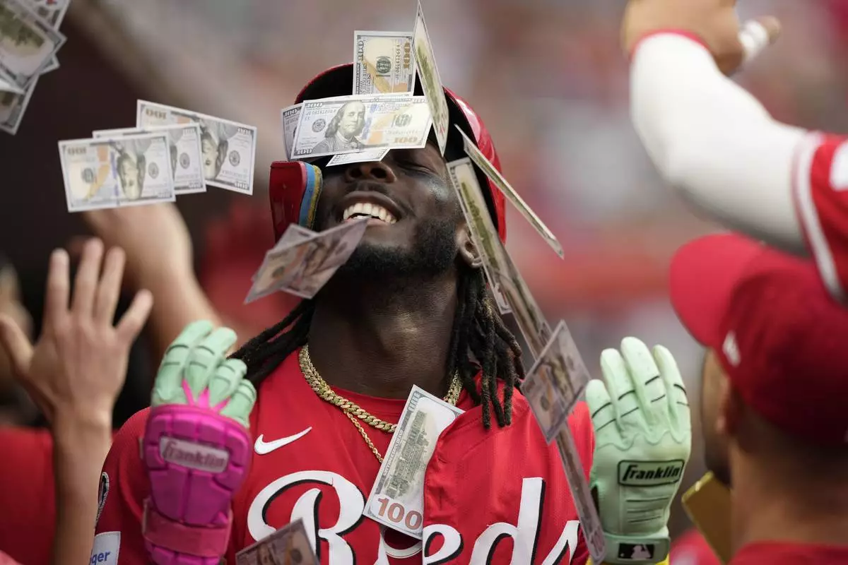 Teammates shower Cincinnati Reds' Elly De La Cruz with play money in the dugout after his two-run homer during the third inning of a baseball game against the Atlanta Braves, in Cincinnati, Thursday, July 31, 2025. (AP Photo/Carolyn Kaster)