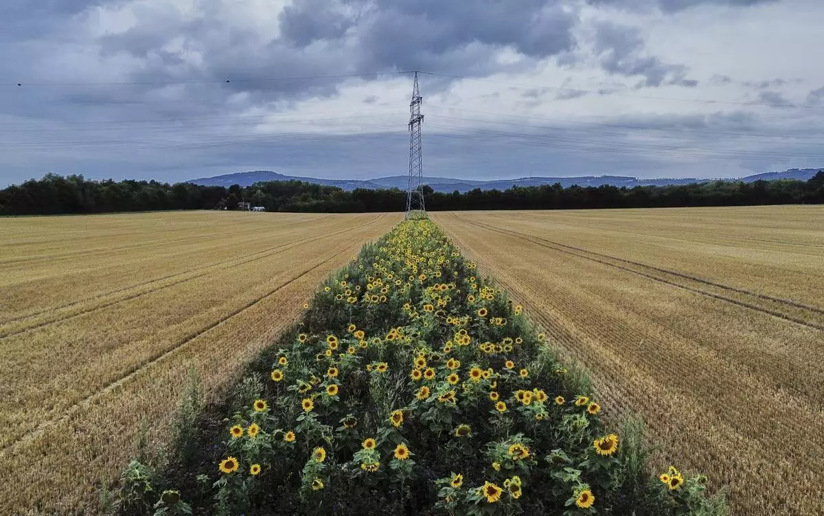 A small field of sunflowers is pictured in the outskirts of Frankfurt, Germany, Thursday, July 31, 2025. (AP Photo/Michael Probst)