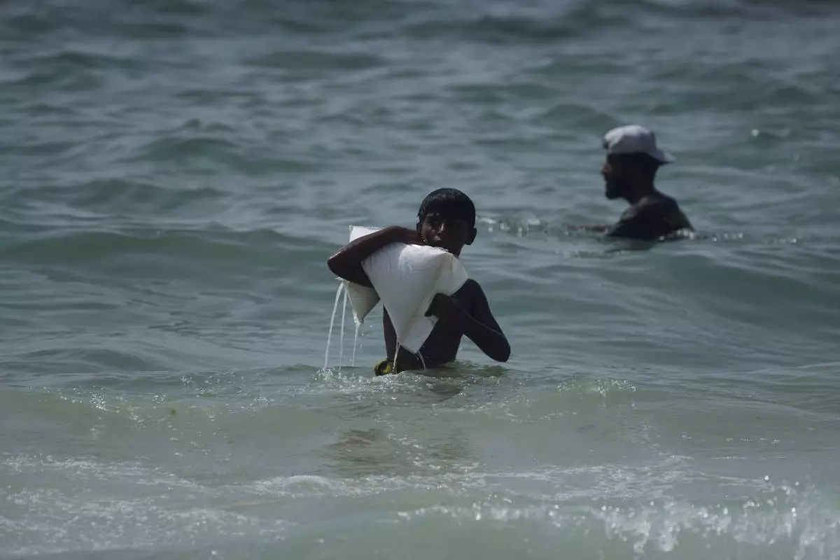 FILE - A Palestinian youth carries a sack of aid that landed in the Mediterranean Sea after being airdropped over central Gaza, Gaza Strip Tuesday, July 29, 2025. (AP Photo/Abdel Kareem Hana, File)