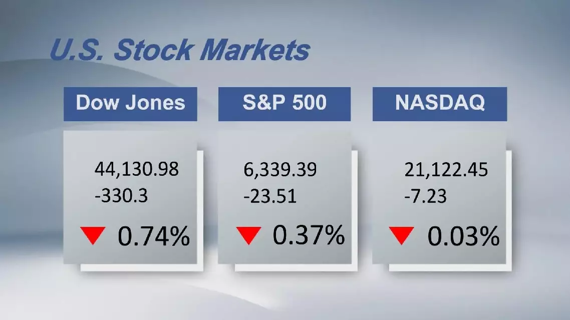 The Dow Jones Industrial Average fell 330.3 points, or 0.74 percent, to 44,130.98. The Standard and Poor's 500 sank 23.51 points, or 0.37 percent, to 6,339.39. The Nasdaq Composite Index shed 7.23 points, or 0.03 percent, to 21,122.45.