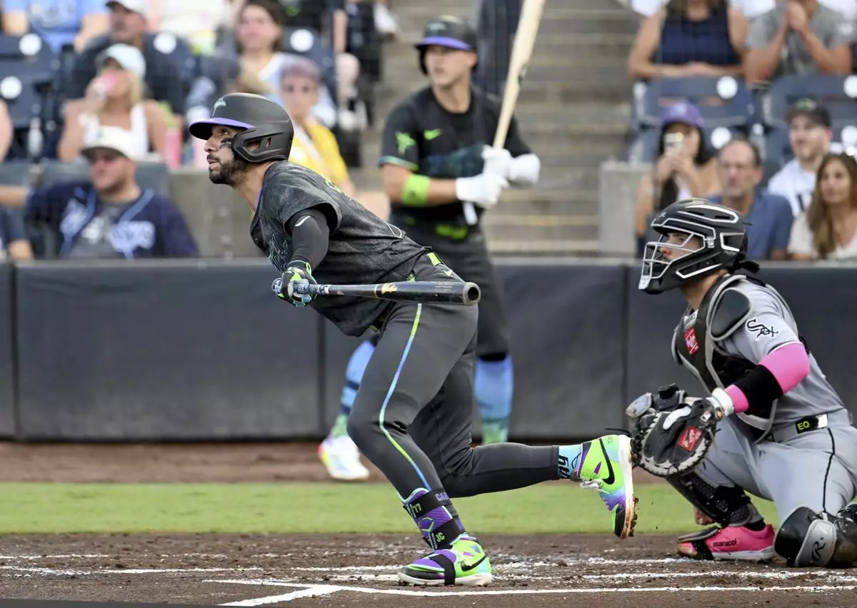 Tampa Bay Rays' José Caballero singles during the second inning of a baseball game against the Chicago White Sox Tuesday, July 22, 2025, in Tampa, Fla. (AP Photo/Jason Behnken)