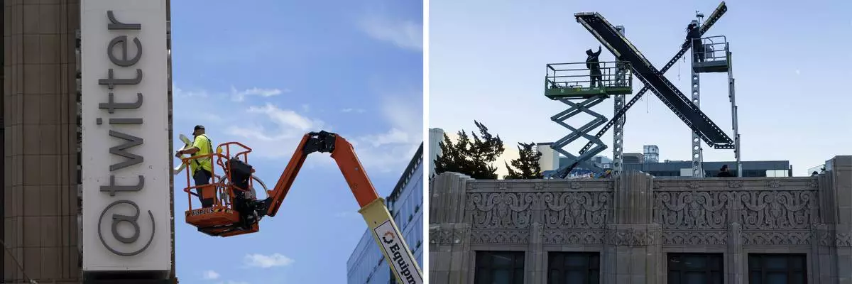 In this combination of 2023 photos, a worker removes parts of a sign on the Twitter headquarters building in San Francisco, on July 24, right; and workers install lighting on an "X" sign atop the downtown San Francisco building that housed what was previously known as Twitter, rebranded "X" by new owner Elon Musk, on July 28. (AP Photos/Godofredo A. Vásquez, Noah Berger)