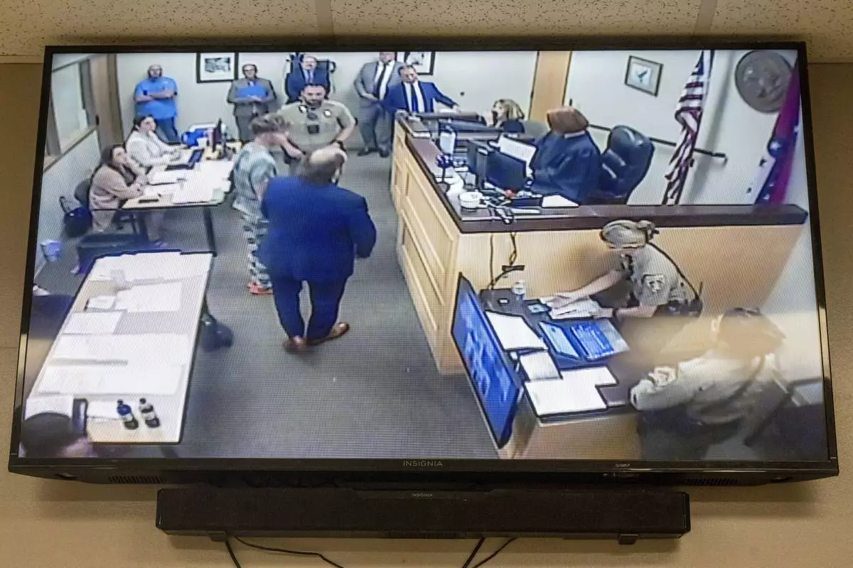 Andrew James McGann, charged with two counts of capital murder, is seen on the video monitor as he appears in front of District Judge Terra Stephenson for his bond hearing at the Washington County Detention Center. Friday, Aug, 1, 2025, in Fayetteville, Ark. (AP Photo/Michael Woods)