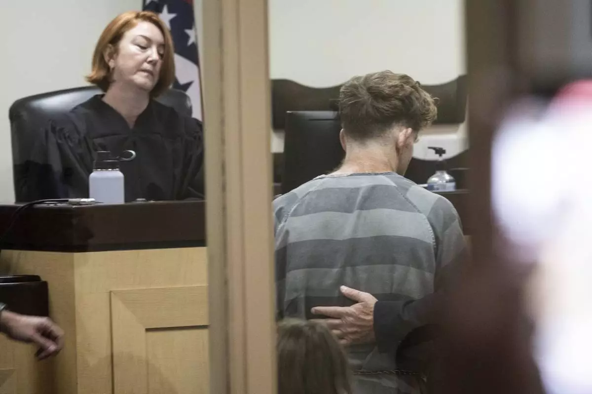 Andrew James McGann, charged with two counts of capital murder, appears in front of District Judge Terra Stephenson for his bond hearing at the Washington County Detention Center. Friday, Aug, 1, 2025, in Fayetteville, Ark. (AP Photo/Michael Woods)