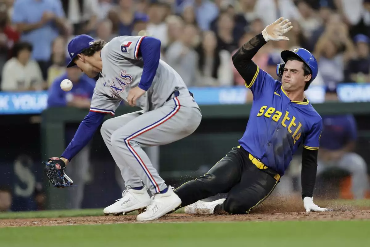 Seattle Mariners' Cole Young scores on a passed ball as Texas Rangers pitcher Jacob Latz reaches for the ball in a baseball game Thursday, July 31, 2025, in Seattle. (AP Photo/John Froschauer)
