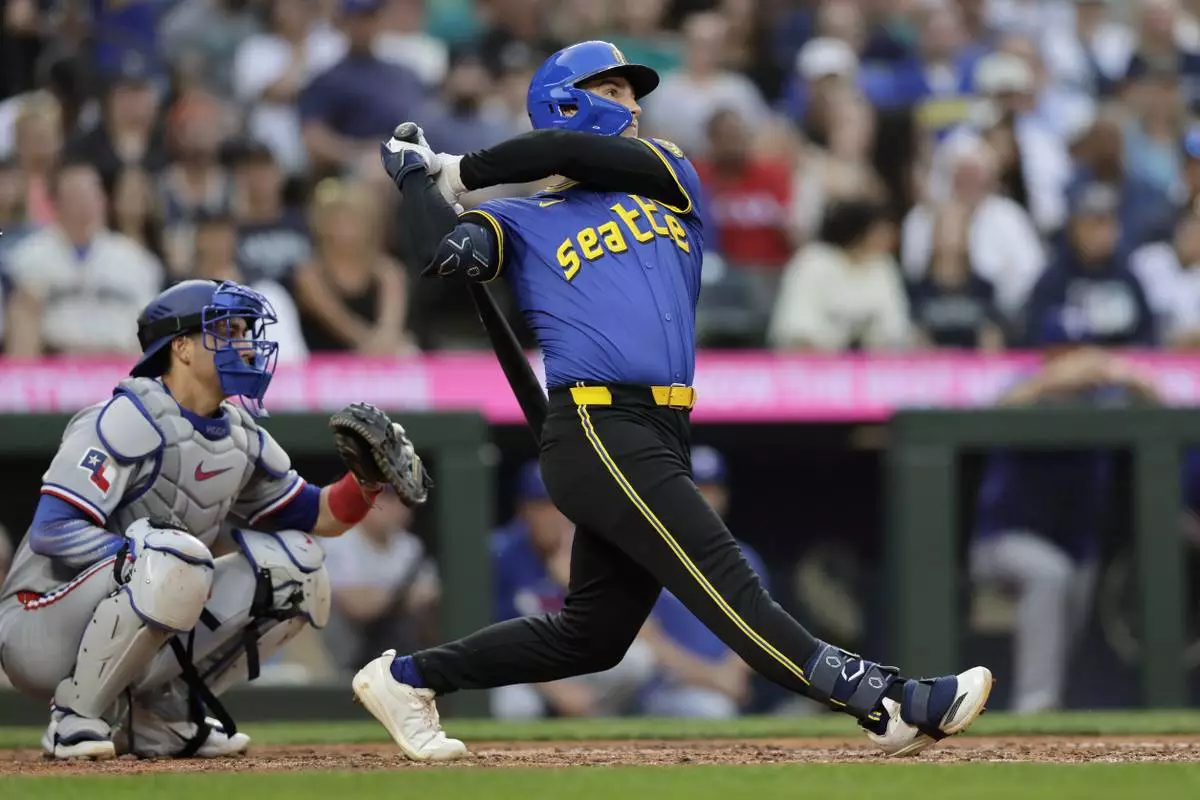 Eguenio Suárez, back in the Mariners' lineup for the first time she was acquired from Arizona on Wednesday night, doubled against Rangers starter Kumar Rocker in the fourth inning and scored on a wild pitch to get Seattle on the scoreboard. Suárez played for the Mariners from 2022-23.