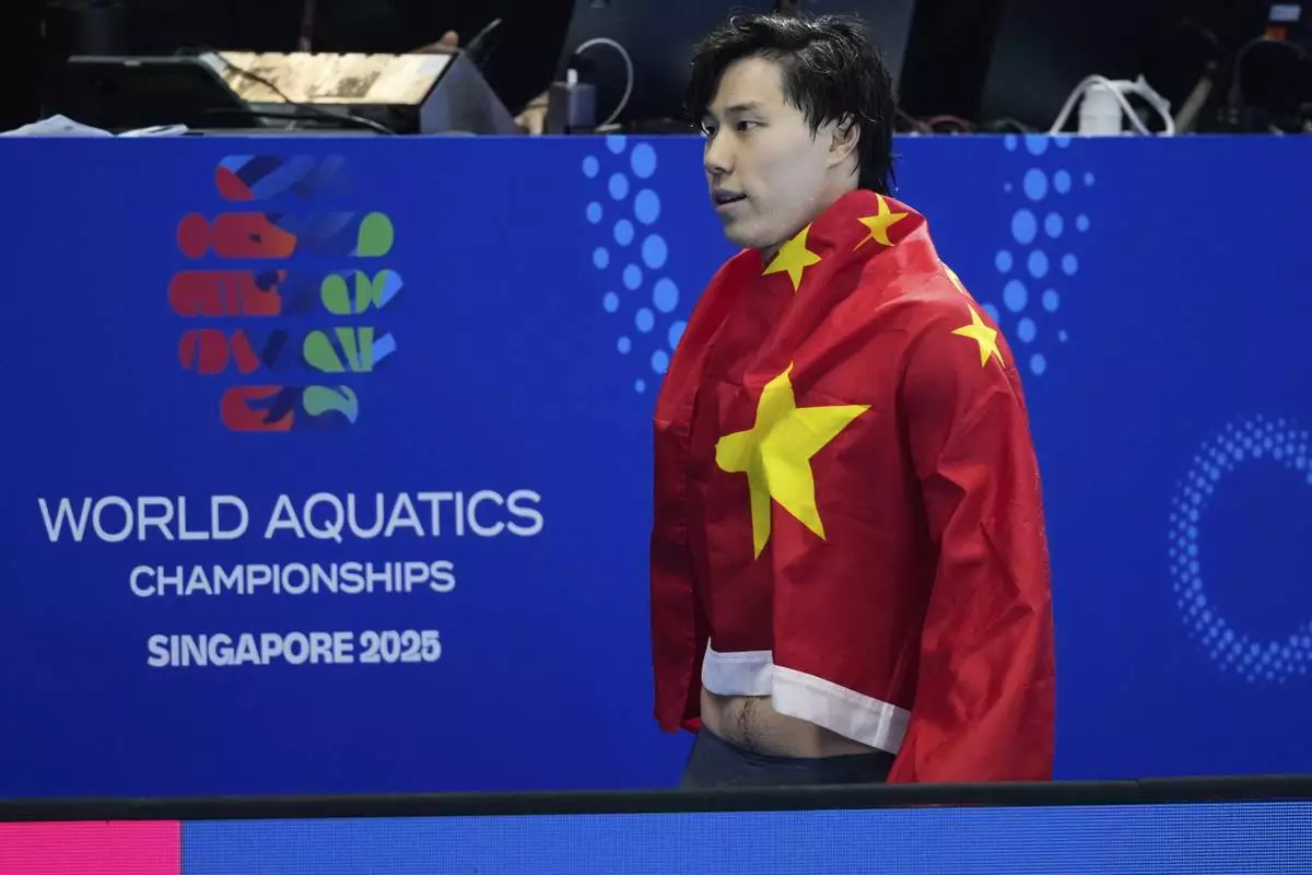Qin Haiyang of China celebrates after winning gold medal in the men's 200-meter breaststroke final at the World Aquatics Championships in Singapore, Friday, Aug.1, 2025. (AP Photo/Vincent Thian)