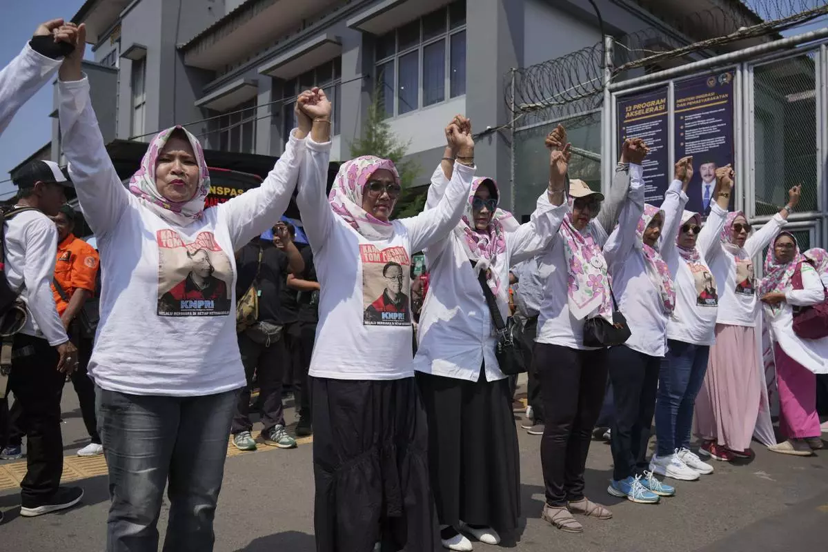 Supporters of Indonesia's former Trade Minister Tom Lembong, who was sentenced to more than four years in prison gather in front of the gate of Cipinang prison in Jakarta, Indonesia, Friday, Aug. 1, 2025 as the country prepares to release hundreds of prisoners under president's clemency plan. (AP Photo/Achmad Ibrahim)
