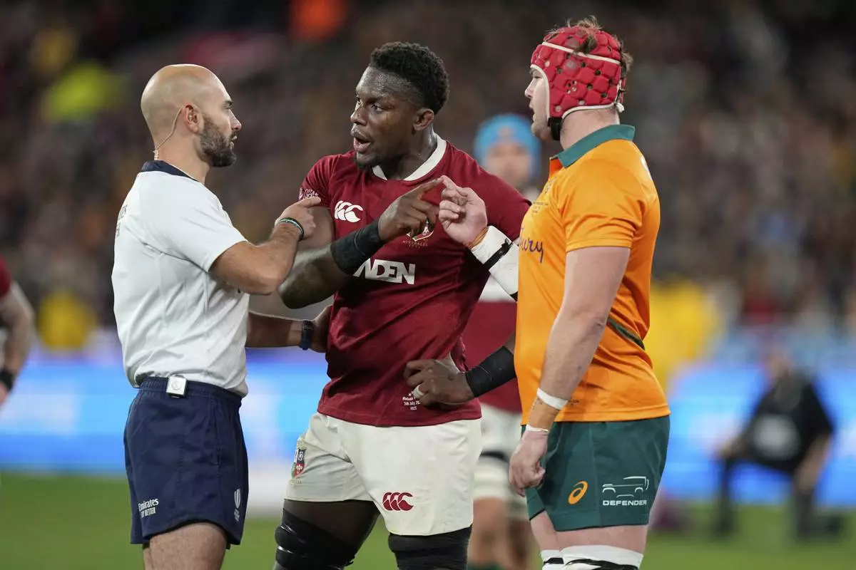 Referee Andrea Piardi speaks to Maro Itoje of the British & Irish Lions and Australia's Harry Wilson, right, during the second rugby union test at the Melbourne Cricket Ground in Melbourne, Australia, Saturday, July 26, 2025. (AP Photo/Rick Rycroft)