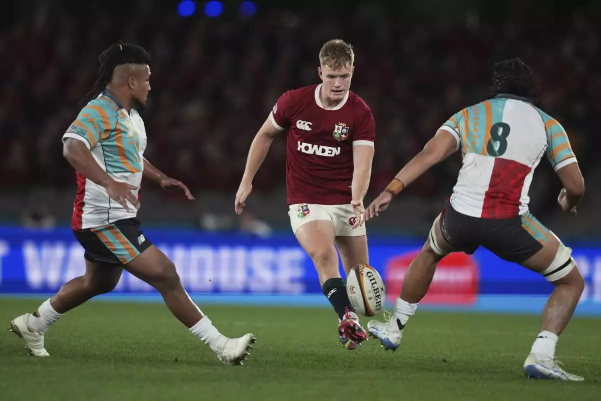 Fin Smith of the British & Irish Lions, center, chips the ball between First Nations & Pacifika XV's Brandon Paenga-Amosa, left, and Tuaina Taii Tualima during their rugby union match in Melbourne, Australia, Tuesday, July 22, 2025. (AP Photo/Asanka Brendon Ratnayake)