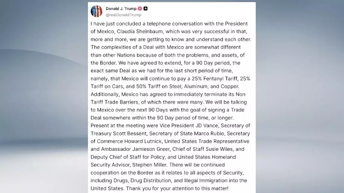 Trump also stressed the unique "complexities" of U.S.-Mexico relations due to shared border issues, while announcing plans to negotiate a comprehensive trade deal within the 90-day window.
