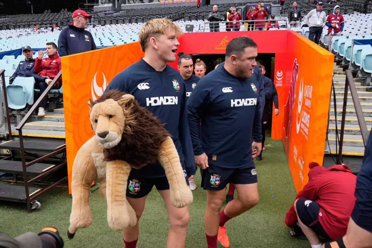 Henry Pollock of the British & Irish Lions, left, carries his team's mascot as he arrives for their captain's run training session in Sydney, Australia, Friday, Aug. 1, 2025, ahead of their rugby union test match against Australia on Saturday. (AP Photo/Rick Rycroft)