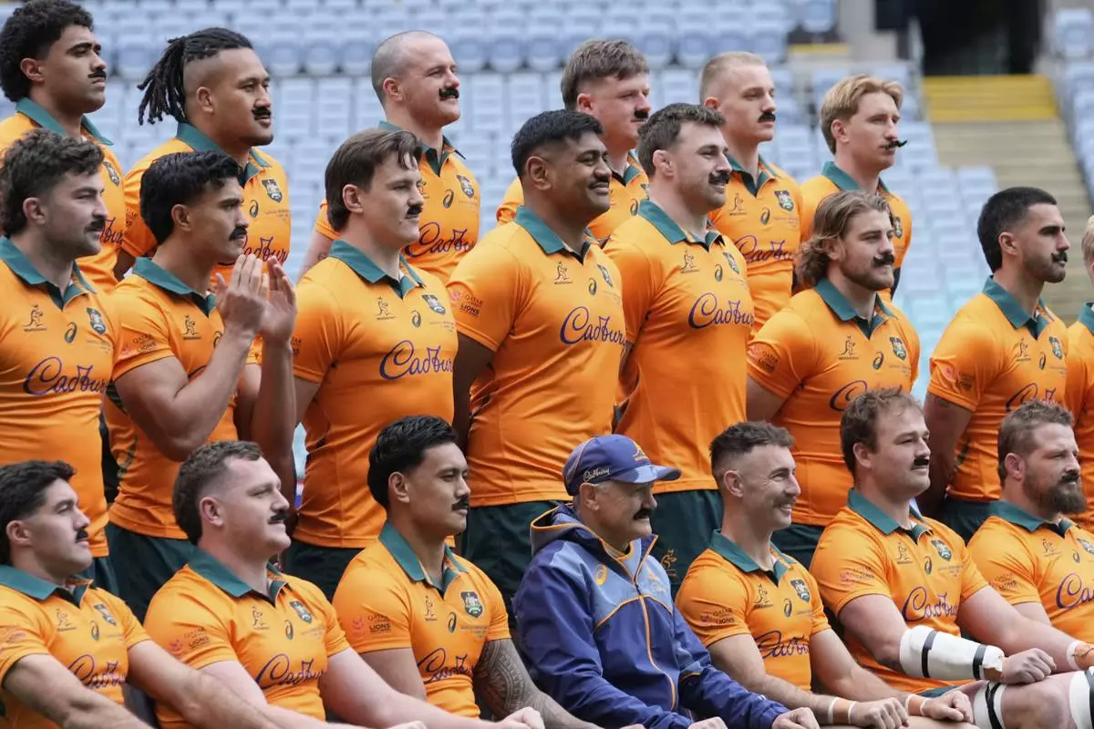 Australian players all wear fake moustaches as a tribute to retiring teammate Australia's Nic White, third from bottom right, as they pose for a photo before their captain's run training session in Sydney, Australia, Friday, Aug. 1, 2025, ahead of the rugby union test match against the British & Irish Lions, Saturday. (AP Photo/Rick Rycroft)
