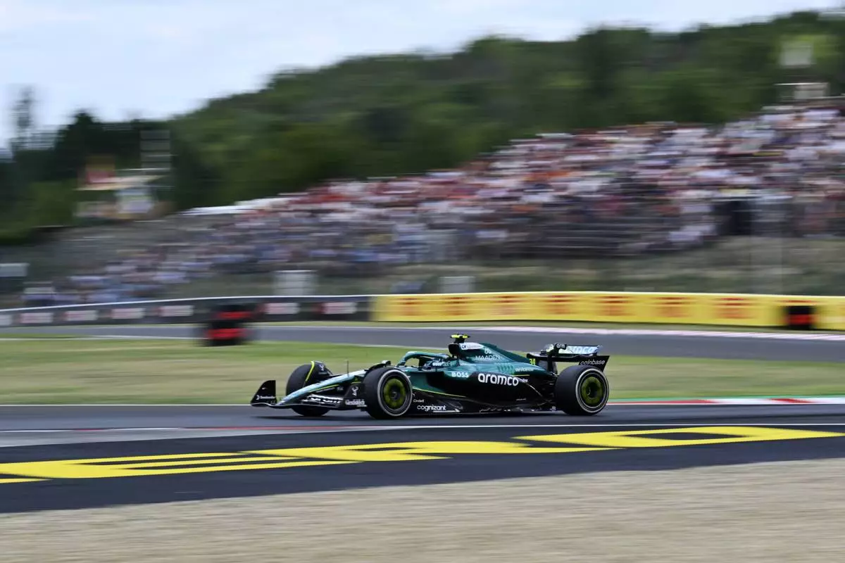 Aston Martin driver Fernando Alonso of Spain steers his car out of the garage during the second free practice at the Hungaroring racetrack in Mogyorod, Hungary, Friday, Aug. 1, 2025, ahead of the Hungarian Formula One Grand Prix. (AP Photo/Denes Erdos)