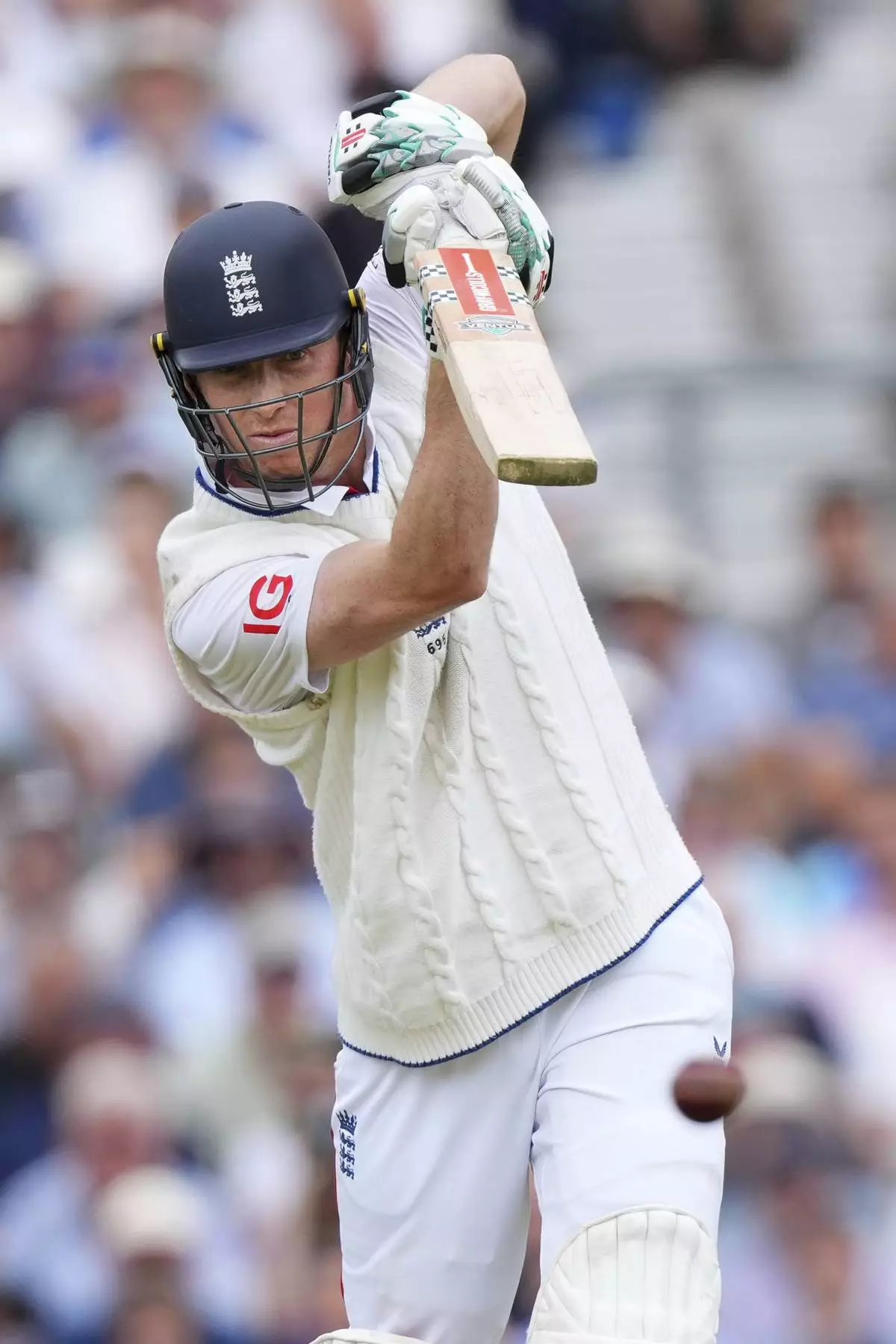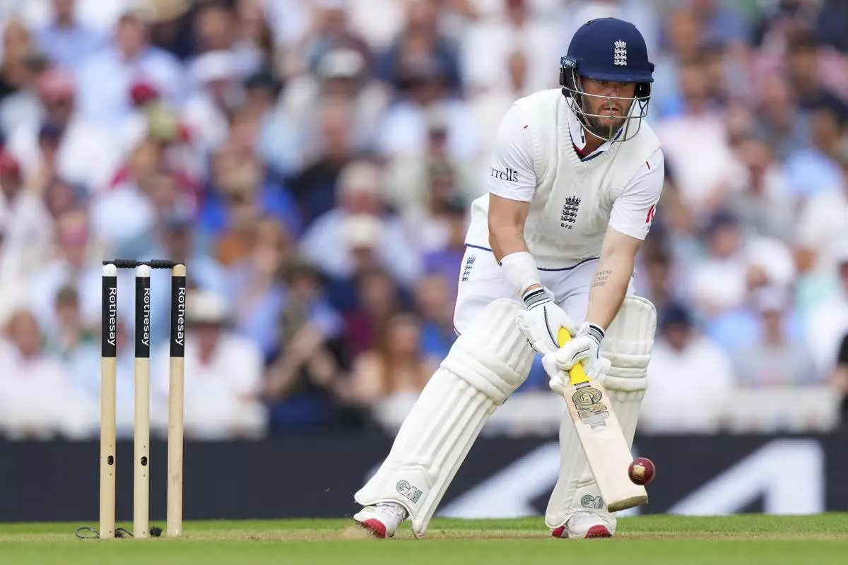 England's Zak Crawley plays a shot during the second day of the fifth cricket test match between England and India at The Kia Oval in London, Friday, Aug. 1, 2025. (AP Photo/Kirsty Wigglesworth)