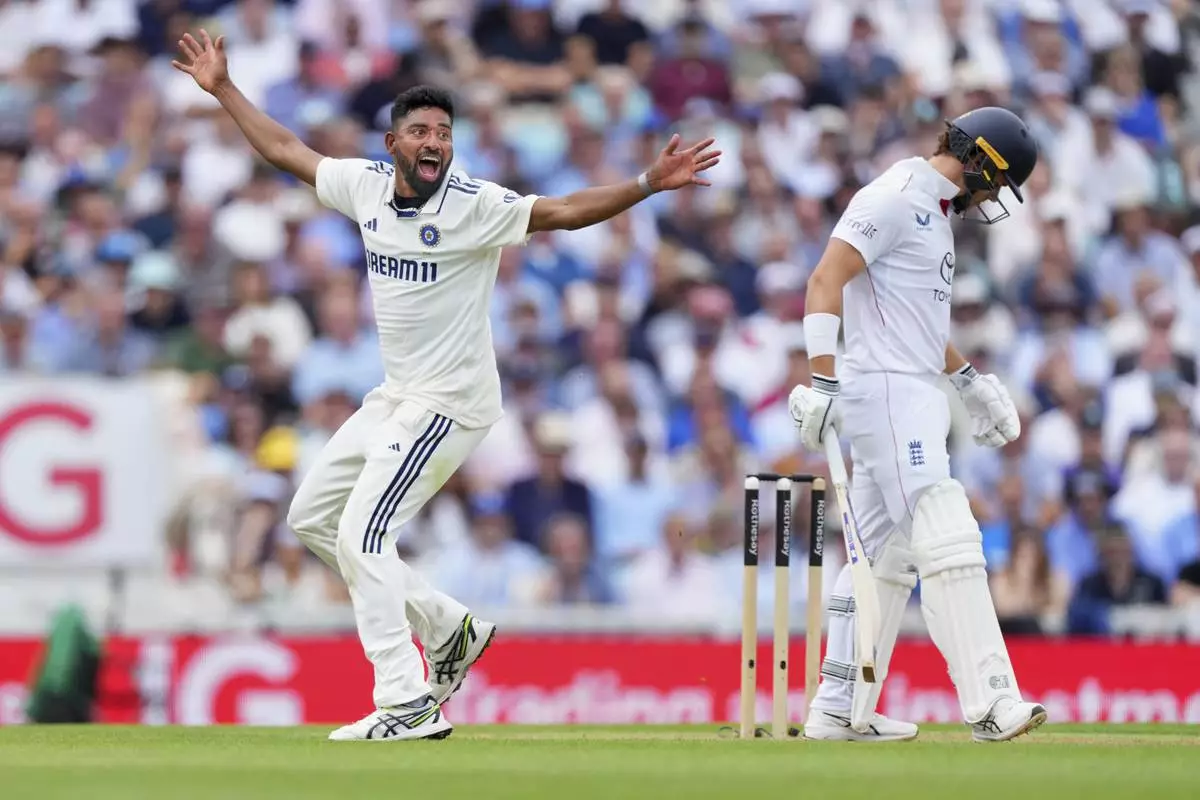 India's Mohammed Siraj appeals successfully for the wicket of England's Ollie Pope, left, during the second day of the fifth cricket test match between England and India at The Kia Oval in London, Friday, Aug. 1, 2025. (AP Photo/Kirsty Wigglesworth)