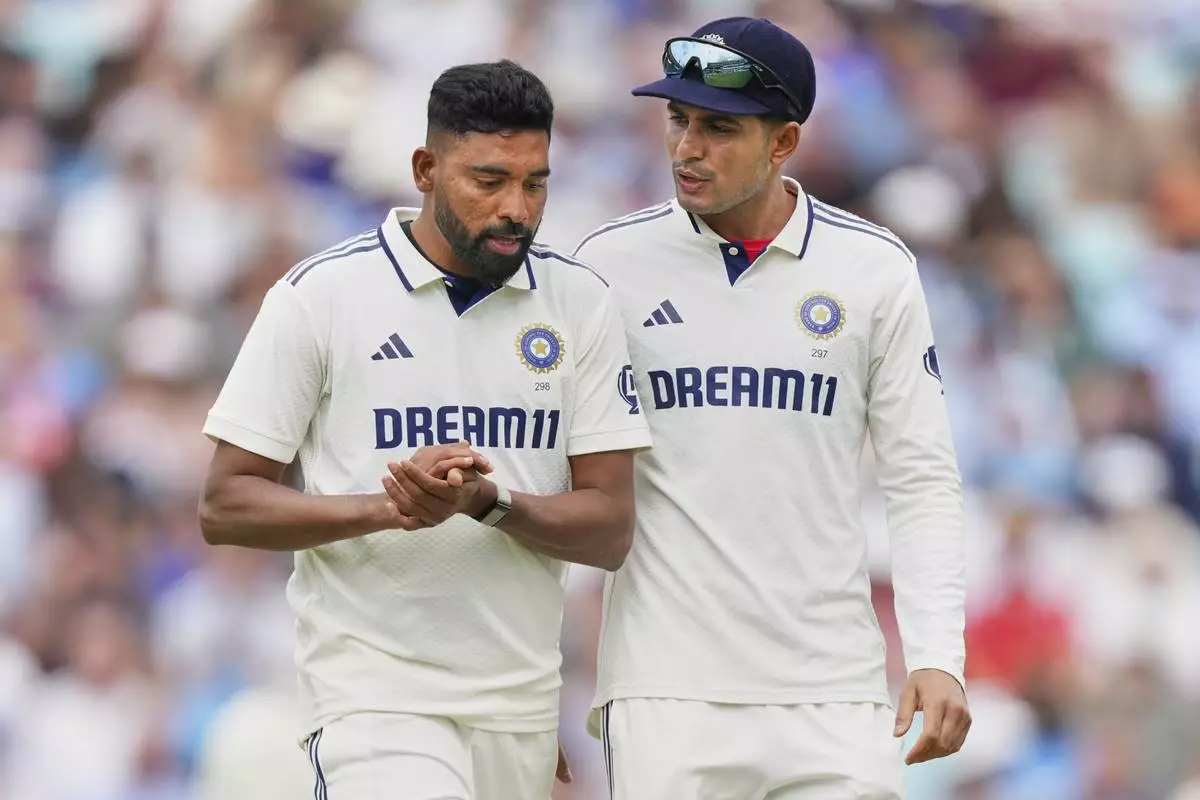 India's captain Shubman Gill, right, talks to India's Mohammed Siraj before bowls a delivery during the second day of the fifth cricket test match between England and India at The Kia Oval in London, Friday, Aug. 1, 2025. (AP Photo/Kirsty Wigglesworth)